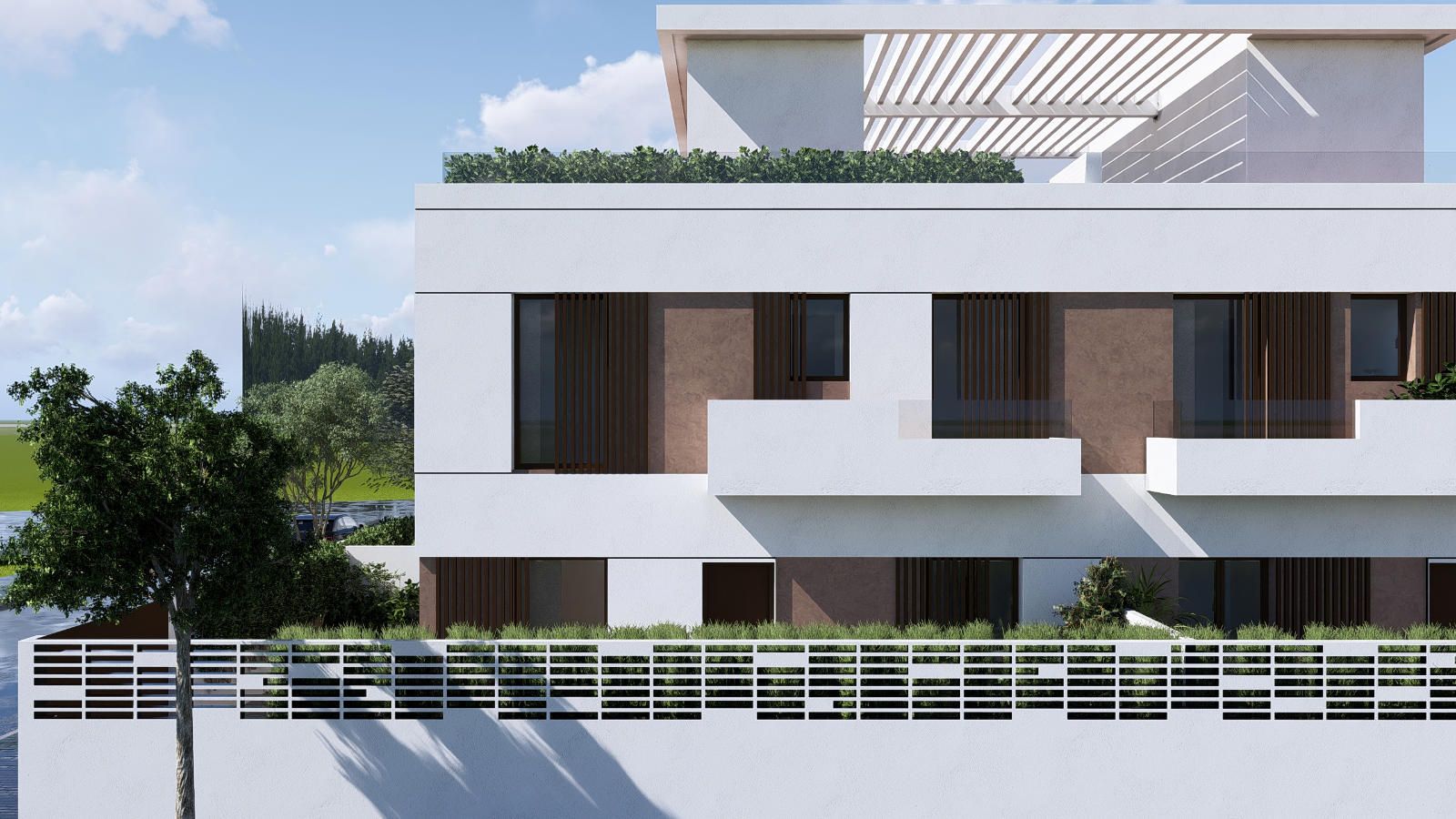 VILLAS DEL FERROCARRIL es una exclusiva promoción de 8 viviendas pareadas ubicadas en un entorno privilegiado de CORRALES, calle Ribera del Odiel con calle Lazareto, Nuevo Corrales, Aljaraque.