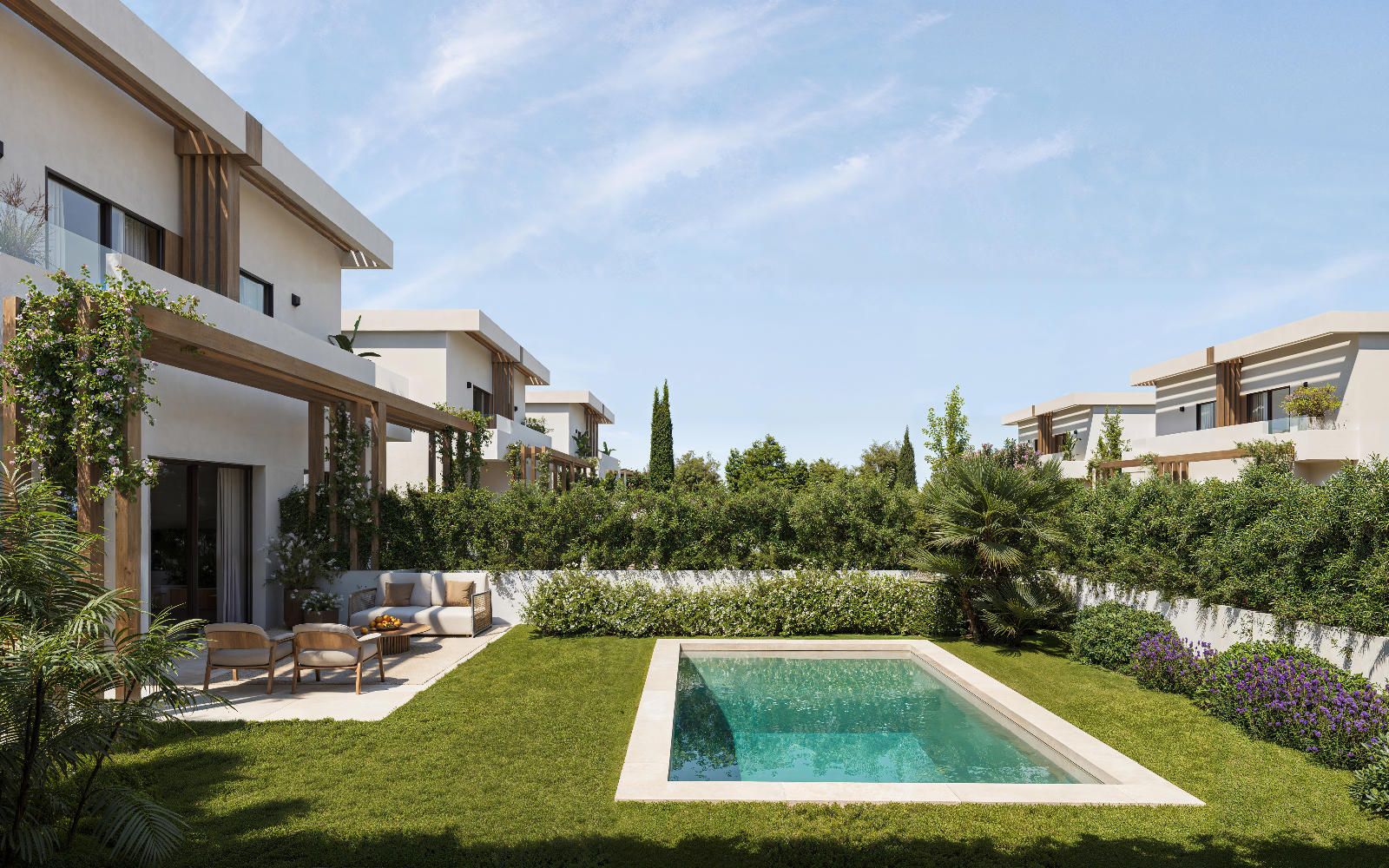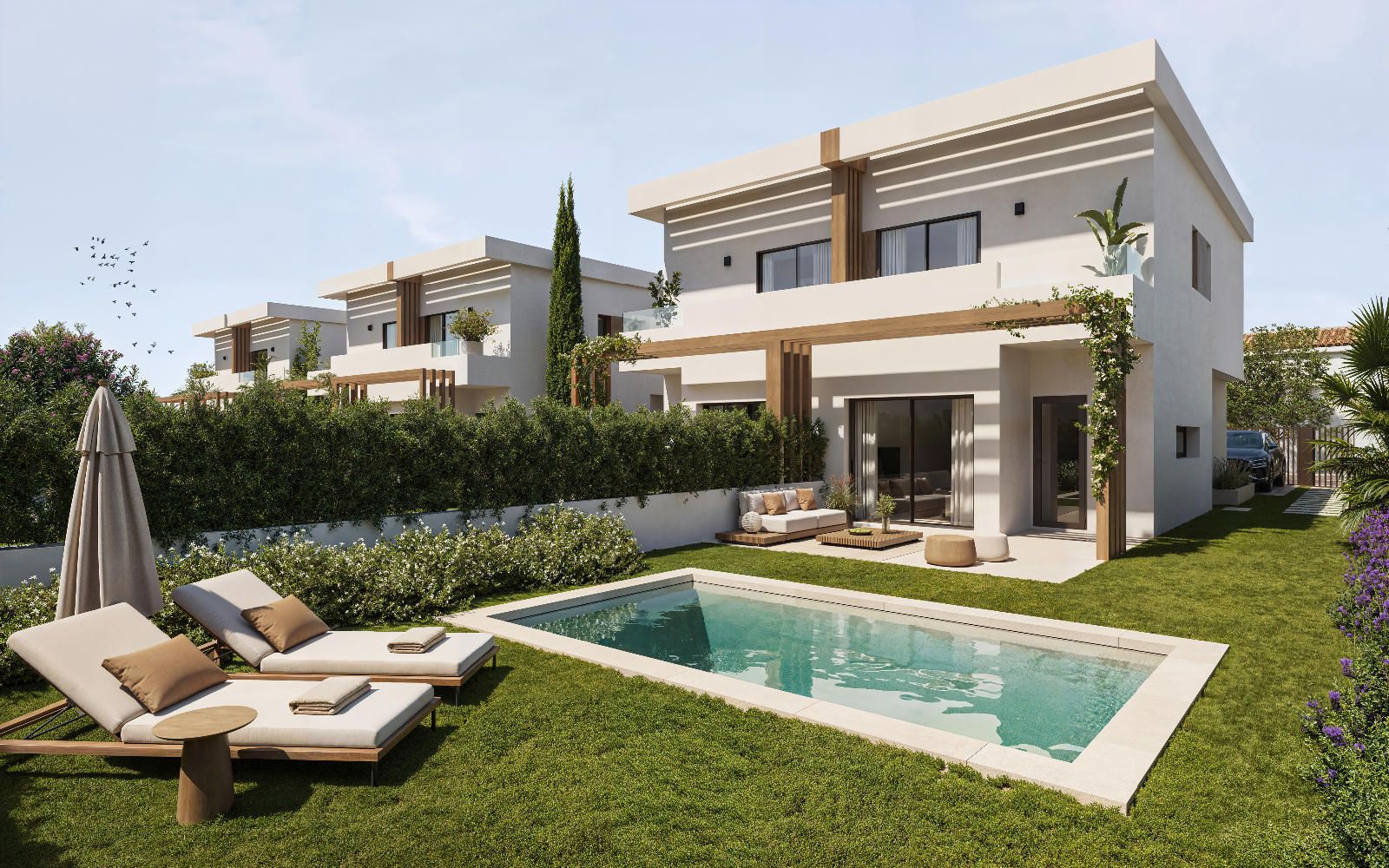 Las viviendas cuentan con un generoso jardín lateral y trasero con zona ajardinada donde podría hacer su piscina privada (La promoción no lleva incluida la piscina)